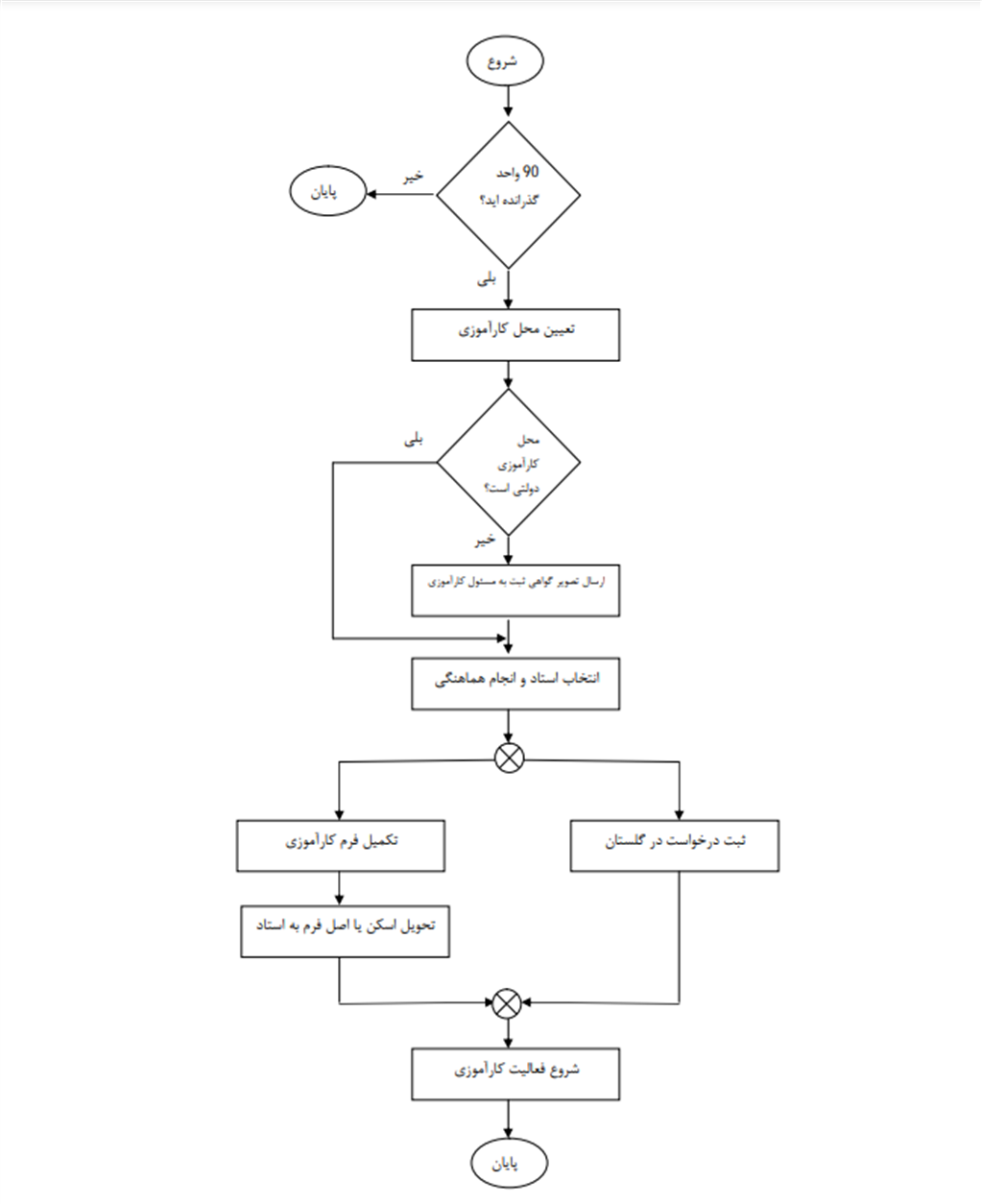 دانشجویان محترم می بایست ابتدا با مراجعه به آموزش از تعداد واحدهای گذرانده و شرایط اخذ کارآموزی اطمینان حاصل کنند. پس از تعیین محل کارآموزی توسط دانشجو، در صورتی که محل مشخص شده شرکتی خصوصی است، دانشجویان می بایست تصویر گواهی ثبت شرکت را در پیام رسان ایتا به مسئول کارآموزی با آی دی @m_heydari۱ ارسال کنند. پس از تایید محل کارآموزی، دانشجویان می بایست یکی از اساتید را به عنوان استاد کارآموزی انتخاب کرده و پس از هماهنگی با وی، درخواست خود را از طریق سامانه گلستان ارسال کنند. فرم های ثبت درخواست کارآموزی موجود در همین صفحه نیز باید پس از تکمیل، به استاد کارآموزی تحویل داده شود. پس از تکمیل دوره کارآموزی و ارائه فرم های گزارش های هفتگی، مستند گزارش کارآموزی مطابق با قالب قرار داده شده باید تحویل استاد کارآموزی شود.